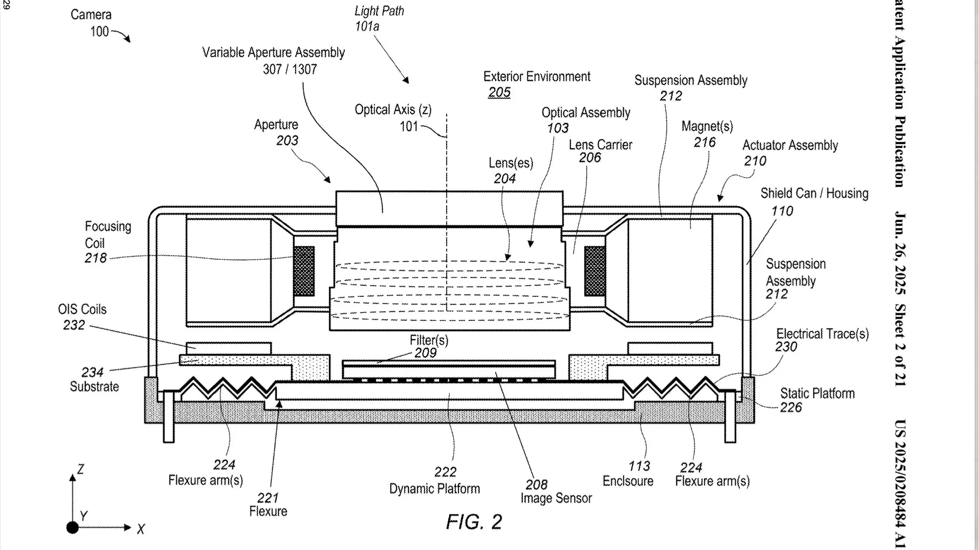 The patent, titled “Camera Module With Variable Lens Aperture With Soft Membrane,” outlines a variable aperture system that ditches traditional overlapping mechanical blades. Instead, it uses a thin, stretchable membrane that can change the size of the aperture through an internal actuator system.