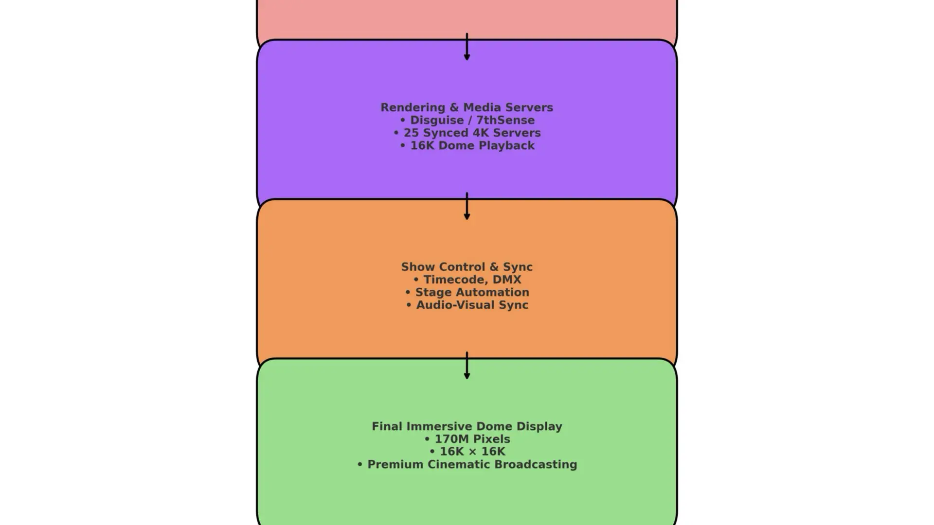 Sphere’s playback system is its own technical marvel. The dome requires 25 synchronized 4K servers feeding segments of the interior LED wall, all locked to a master clock. Each server handles a slice of the dome’s content, but together they form a seamless 16K × 16K canvas.