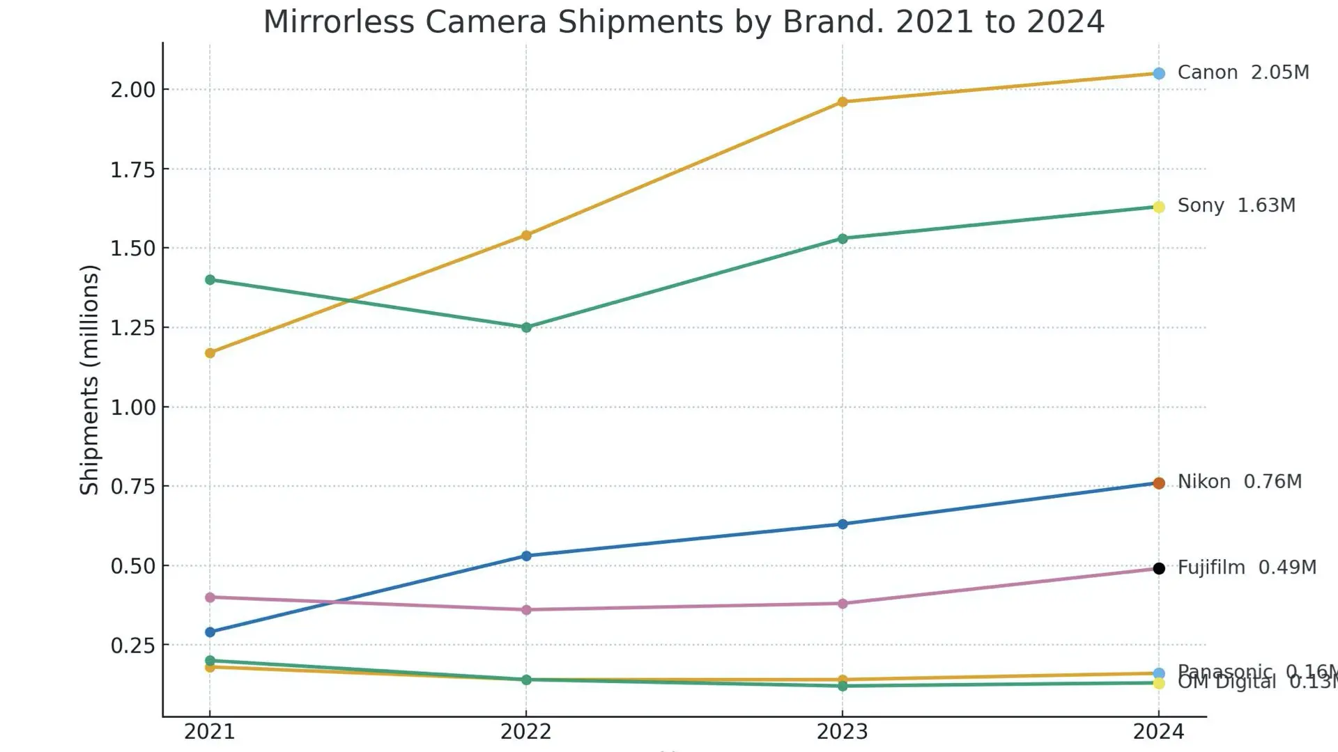 Make the story short: Canon reached 2.05M mirrorless units in 2024. Sony held at 1.63M. Nikon climbed to 0.76M. Fujifilm reached 0.49M. Panasonic and OM Digital stayed near 0.1M. These are unit shipments. Mirrorless only. Global market. Read on.