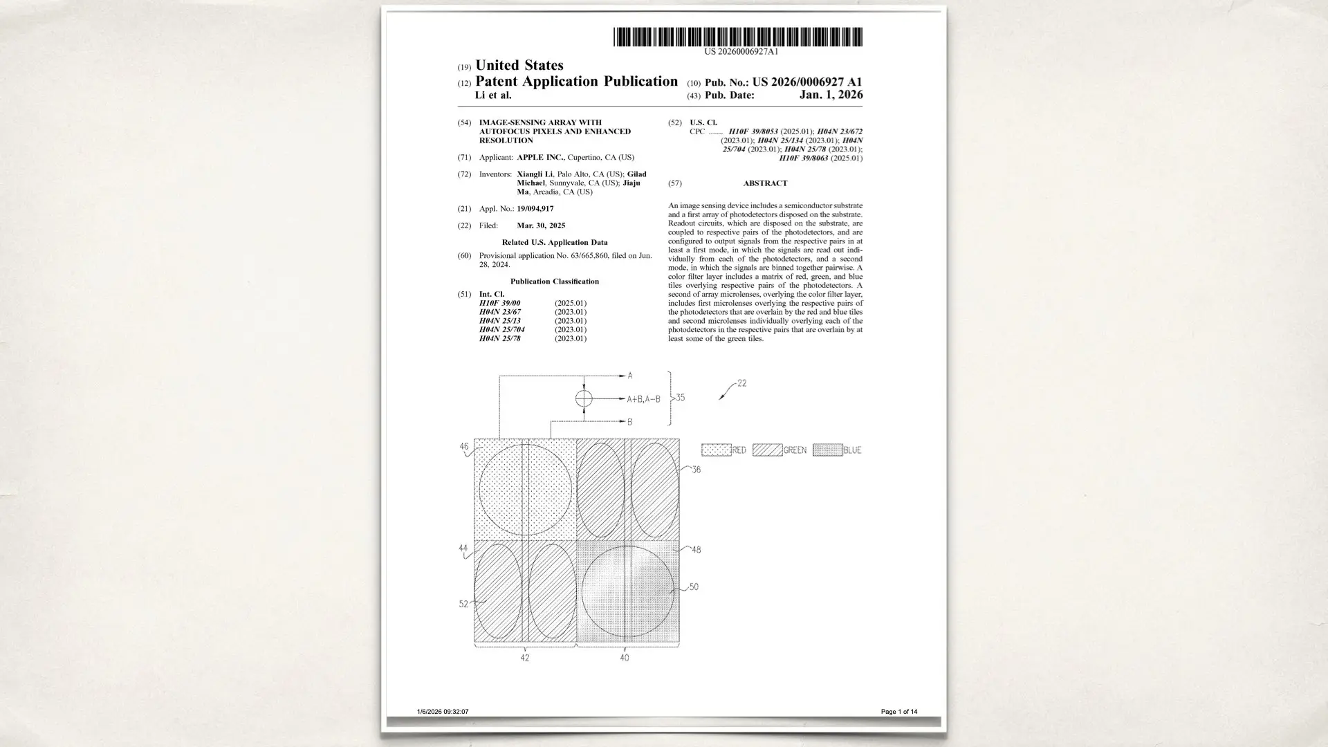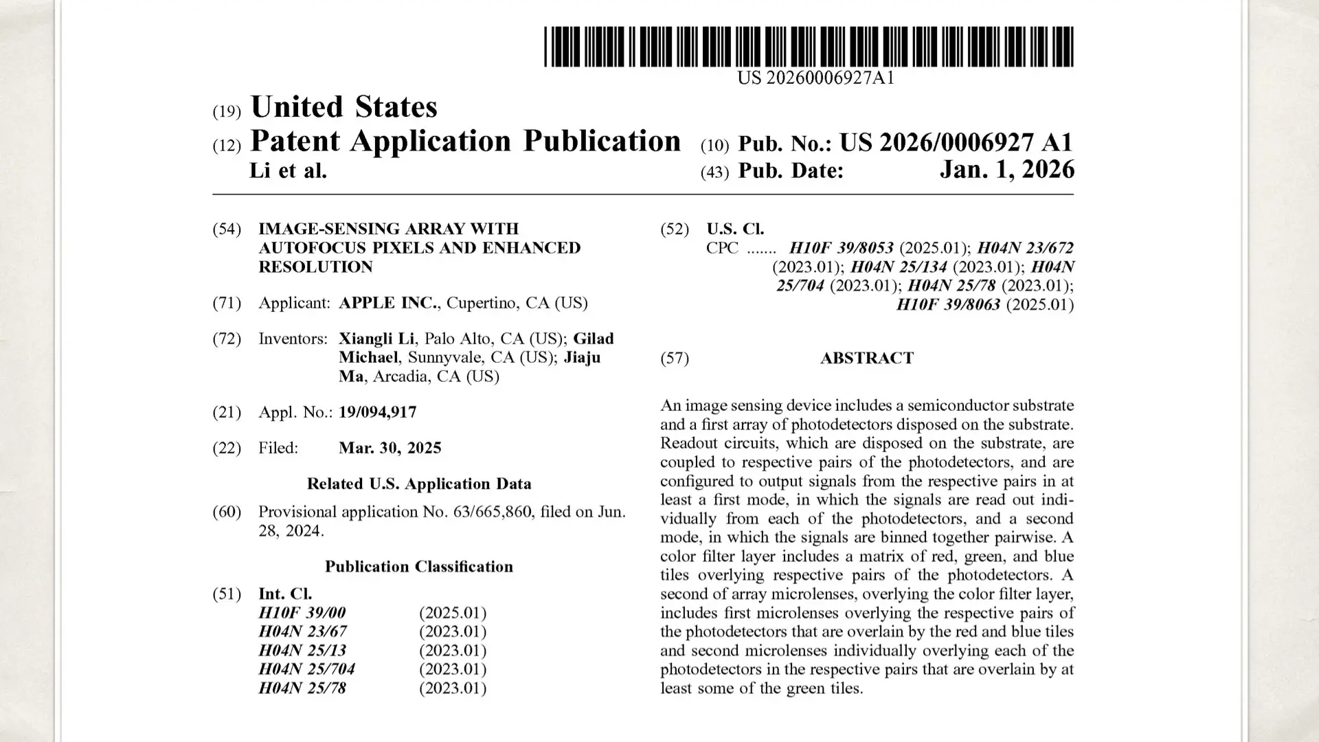 Apple’s patent: Image-sensing Array With Autofocus Pixels And Enhanced Resolution