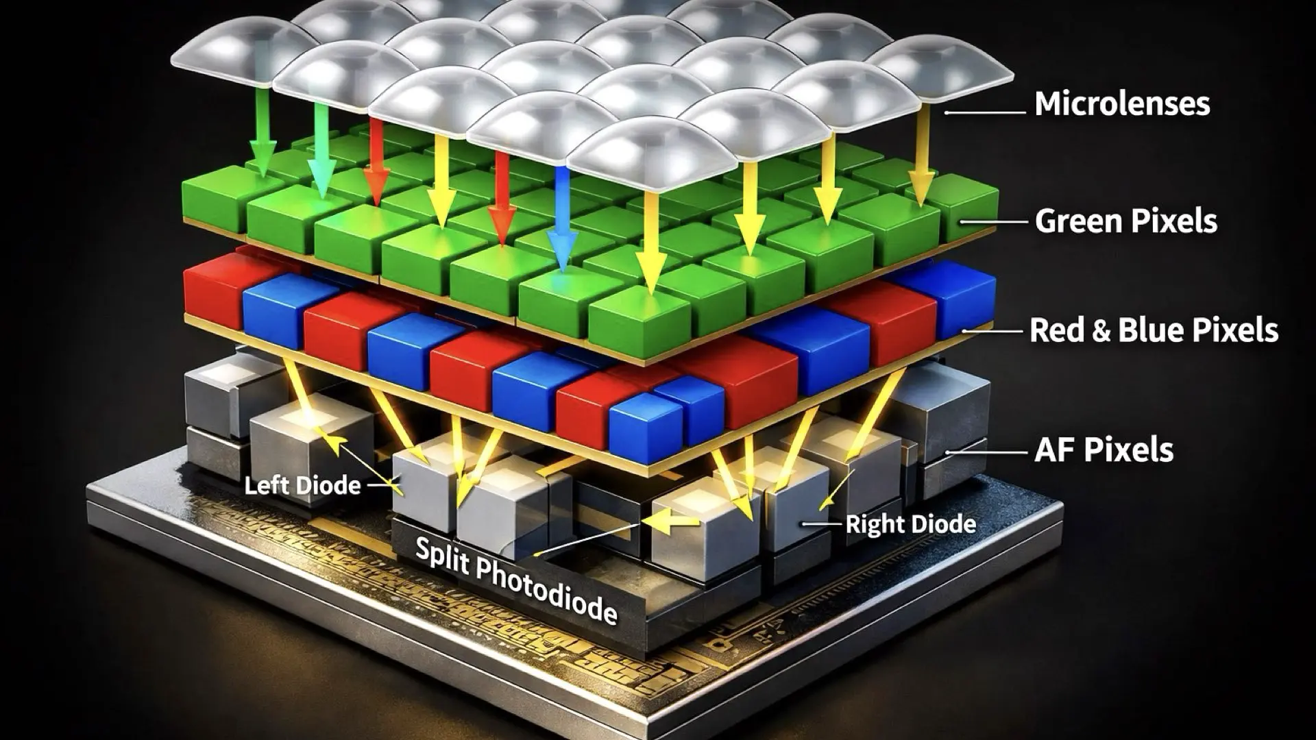 A useful way to think about this is stability first, then focus, then image reconstruction. Apple has already explored the stability side in Apple iPhone Sensor-Shift Stable Focus Handheld Video, where the goal is to keep handheld footage calmer and reduce the kind of micro motion that makes focus look nervous. US 20260006927 A1 fits naturally next to that, because it tries to make the autofocus system itself less damaging to image sharpness. Apple starts from a basic truth about modern color sensors. Most sensors use a Bayer-style color pattern where green is sampled more than red or blue. That matters because green carries most of the brightness information the camera uses to build detail. In plain English, green pixels are where most of the sharpness comes from. The patent explains that when phase detection autofocus pixels sit inside green regions, they can slightly reduce resolution there, because the optical structures used for autofocus can introduce small local blur. For filmmakers, that blur is not just a still photo issue. It can show up as a soft look in fine textures, skin detail, hair, fabric, and distant edges, especially during motion and focus transitions.