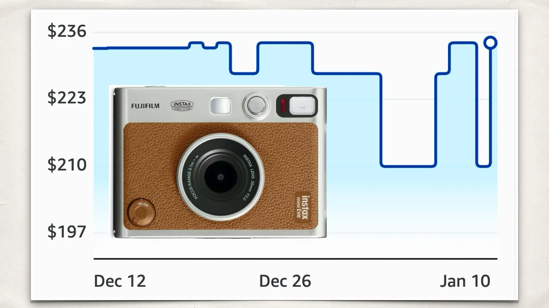 One of the most interesting developments is the recent price movement. According to Amazon’s price tracking, over the past 30 days the Instax Mini EVO Instant Camera Brown ranged from $209.95 to $234.00. The current price sits at $234.00, matching the highest point in that period. This kind of upward movement is unusual for consumer cameras and typically reflects sustained demand rather than supply issues. In other words, the Mini EVO is not being discounted to sell. It is holding value because it continues to move volume at full price. That aligns with its position as a hybrid product that avoids direct competition with smartphones and traditional digital cameras.