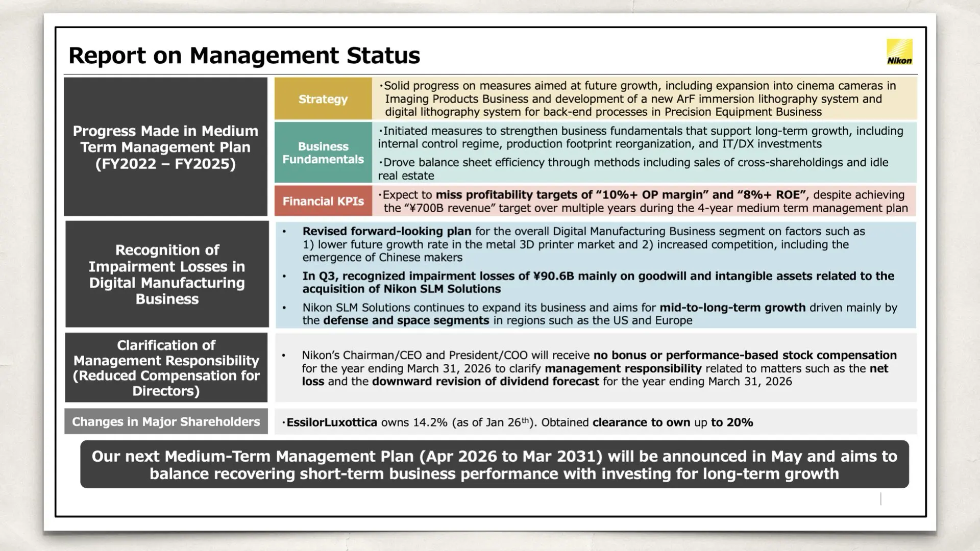 In its official management presentation, Nikon explicitly identifies expansion into cinema cameras as a core future growth initiative. This is not framed as a side business or a temporary experiment. Cinema is mentioned alongside semiconductor lithography as one of the pillars that will carry the company forward over the long term. That wording matters, especially in a document where Nikon openly acknowledges missing profitability targets and posting a projected ¥85B net loss. When a company under financial pressure still highlights cinema as future growth, it reflects strategic intent rather than marketing language.