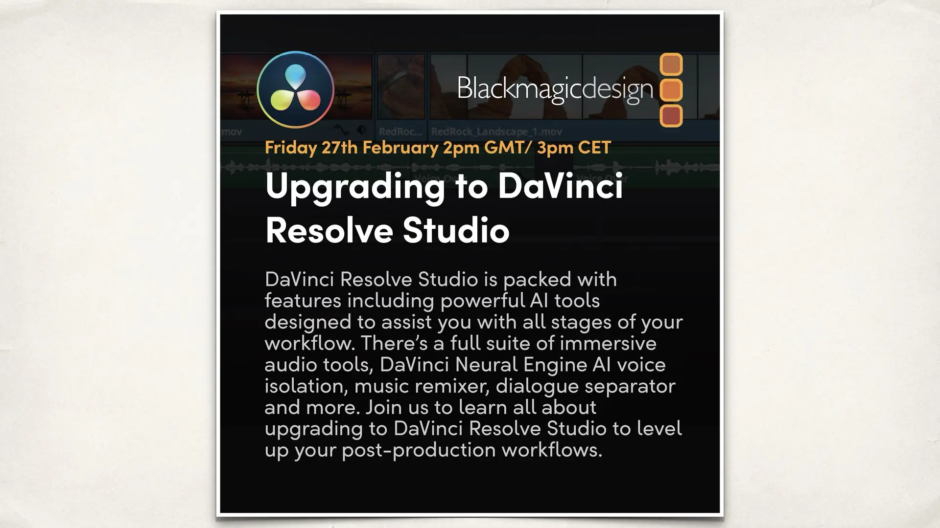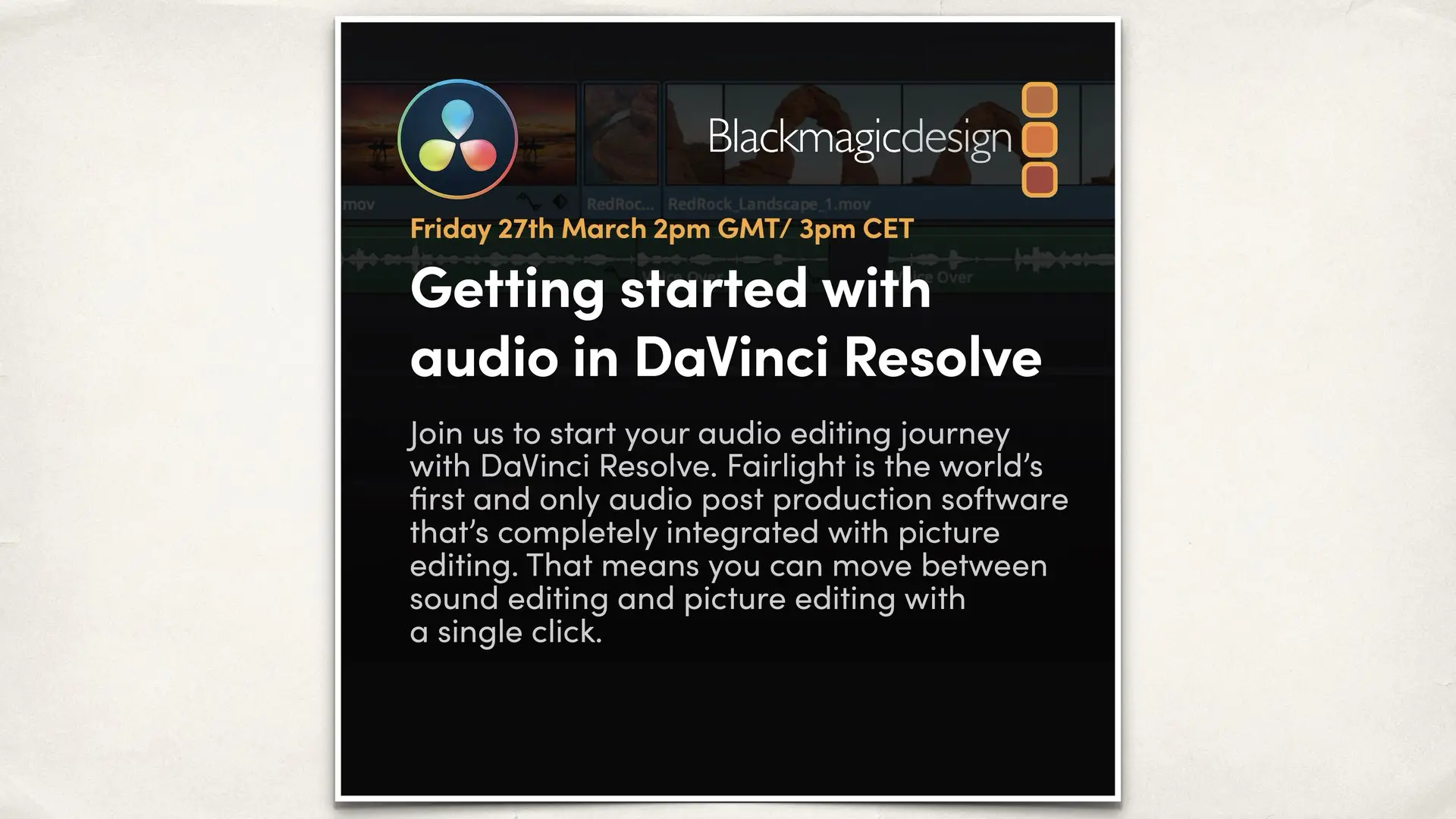 This session introduces the Fairlight audio page and Resolve’s integrated audio post production tools. It covers dialogue editing, audio mixing, sound effects, basic sound design, audio effects, and loudness management. The webinar is aimed at editors who want to complete audio work inside Resolve without external DAWs.