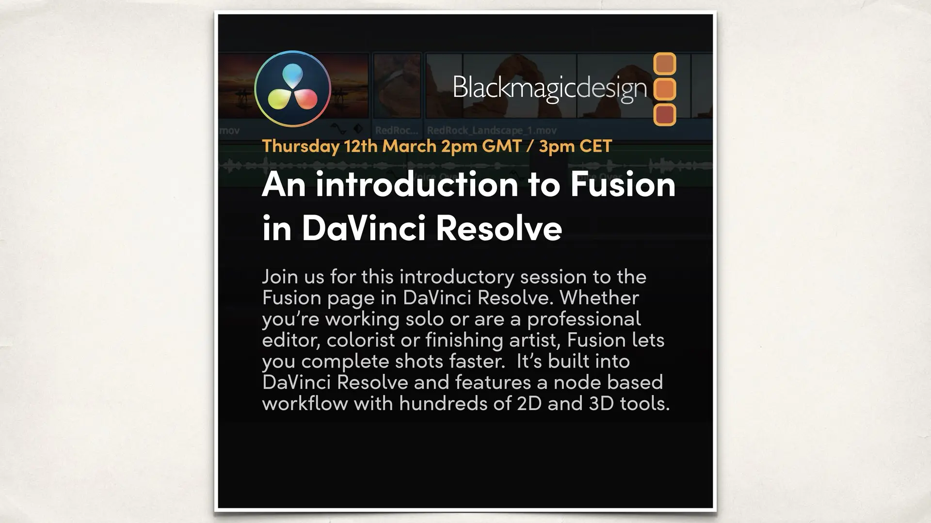 This session introduces Fusion’s node-based compositing environment inside DaVinci Resolve. It covers the fundamentals of working with nodes, creating basic visual effects, motion graphics, titles, masking, and keying. The webinar also explains how Fusion integrates directly into the Resolve timeline, eliminating the need for external compositing software or round tripping.