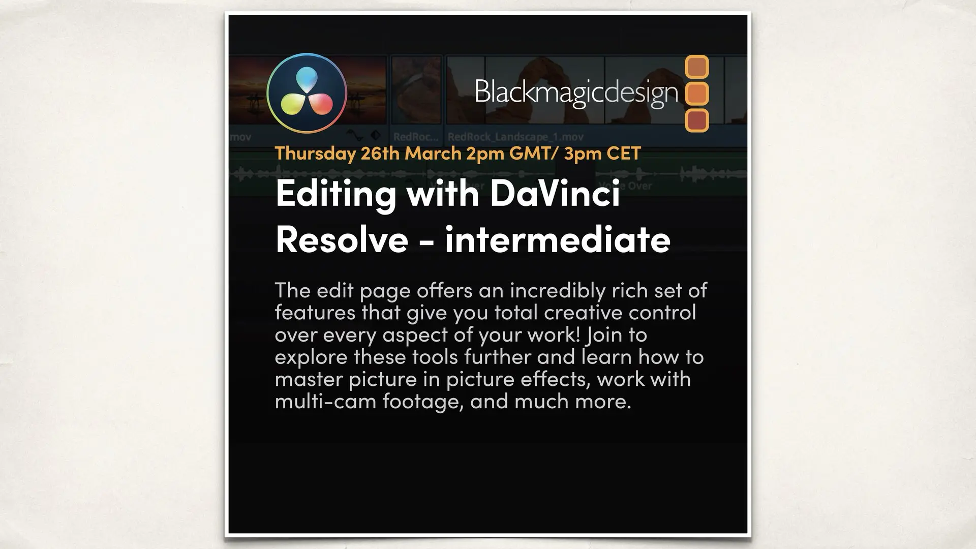 Designed for users with prior Resolve experience, this webinar explores more advanced editing workflows. Topics include multicam editing, proxy media, timeline versioning, collaboration features, media organization strategies, and techniques used in professional editorial environments.
