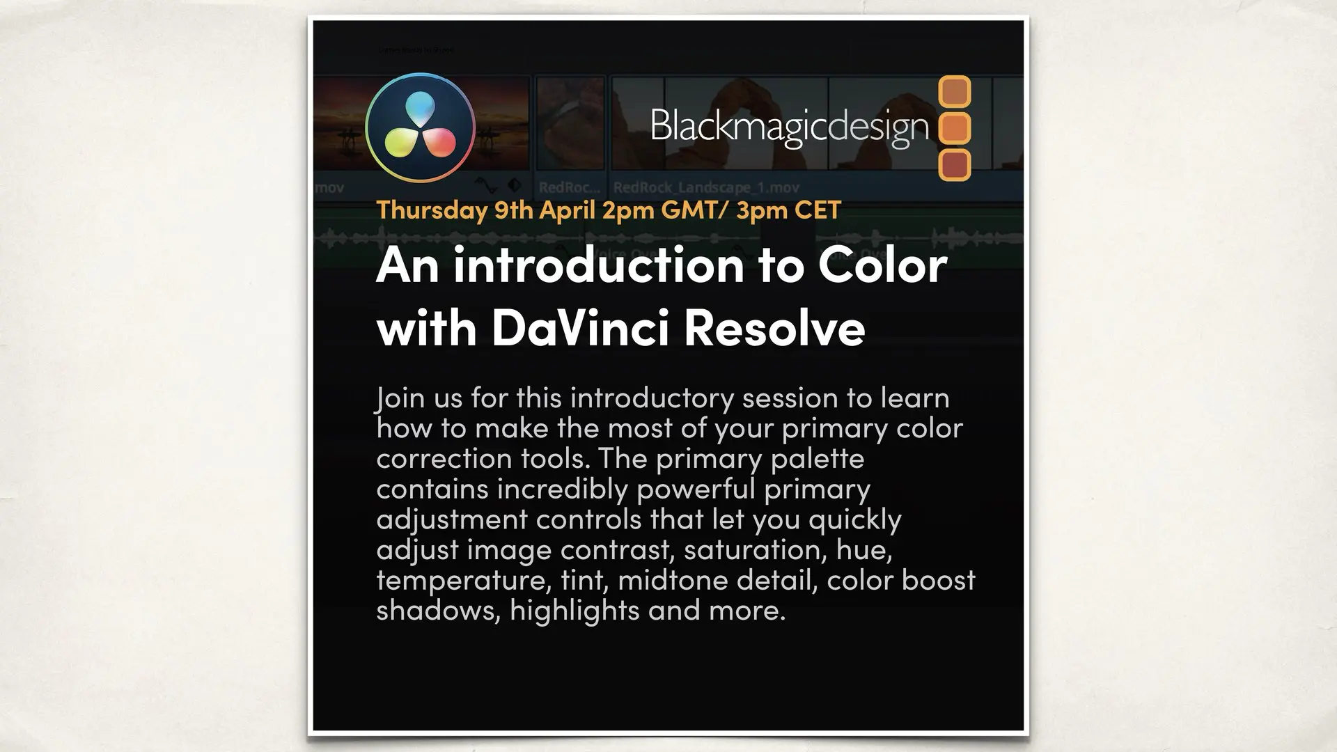 This webinar focuses on the fundamentals of color grading in Resolve. Topics include color management, scopes, primary corrections, node based workflows, balancing shots, and building a clean grading foundation. It is ideal for editors beginning to explore professional color grading workflows.