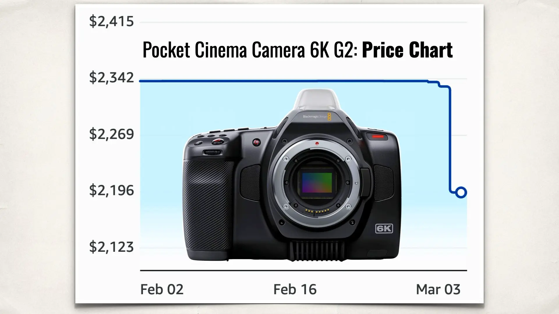The Amazon price history chart shows that throughout February, the Pocket Cinema Camera 6K G2 remained stable at around $2,342. There were no meaningful deviations during that period. In early March, however, the chart displays a sharp vertical drop to $2,195. This type of movement is structurally different from minor marketplace adjustments. It indicates a repositioning to a new pricing level rather than temporary discounting. The timing of this drop closely follows Blackmagic’s public note regarding tariff-related pricing changes, suggesting that this model is among the products benefiting from the revised cost structure.