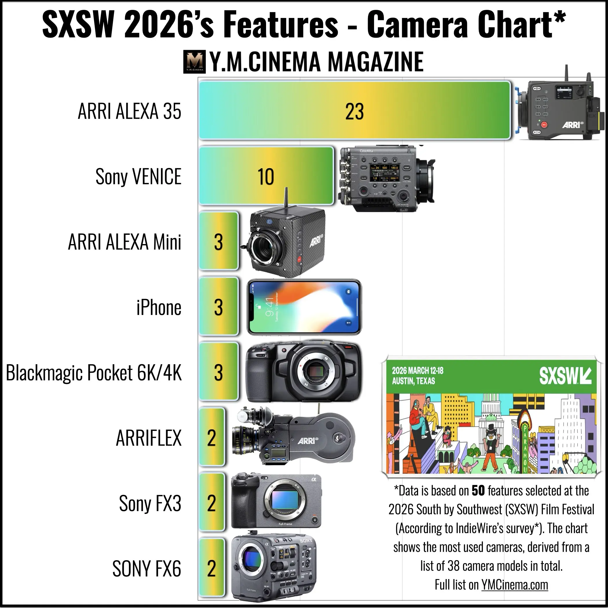 Every year, the SXSW camera survey conducted by IndieWire offers one of the clearest windows into real-world cinematography decisions. The survey asks directors of photography behind SXSW feature films to disclose the cameras and lenses used during production. The result is a rare technical snapshot of what filmmakers actually trust when creating independent features. The 2026 dataset includes 50 feature films and 38 camera models, providing a fascinating look at current cinematography trends. ARRI ALEXA 35 was used in 23 films, meaning nearly half of the SXSW 2026 features relied on this single camera model. That level of dominance is extraordinary and confirms a trend that we already observed last year in our analysis SXSW 2025 Camera Breakdown. Here’s what happens in 2026.