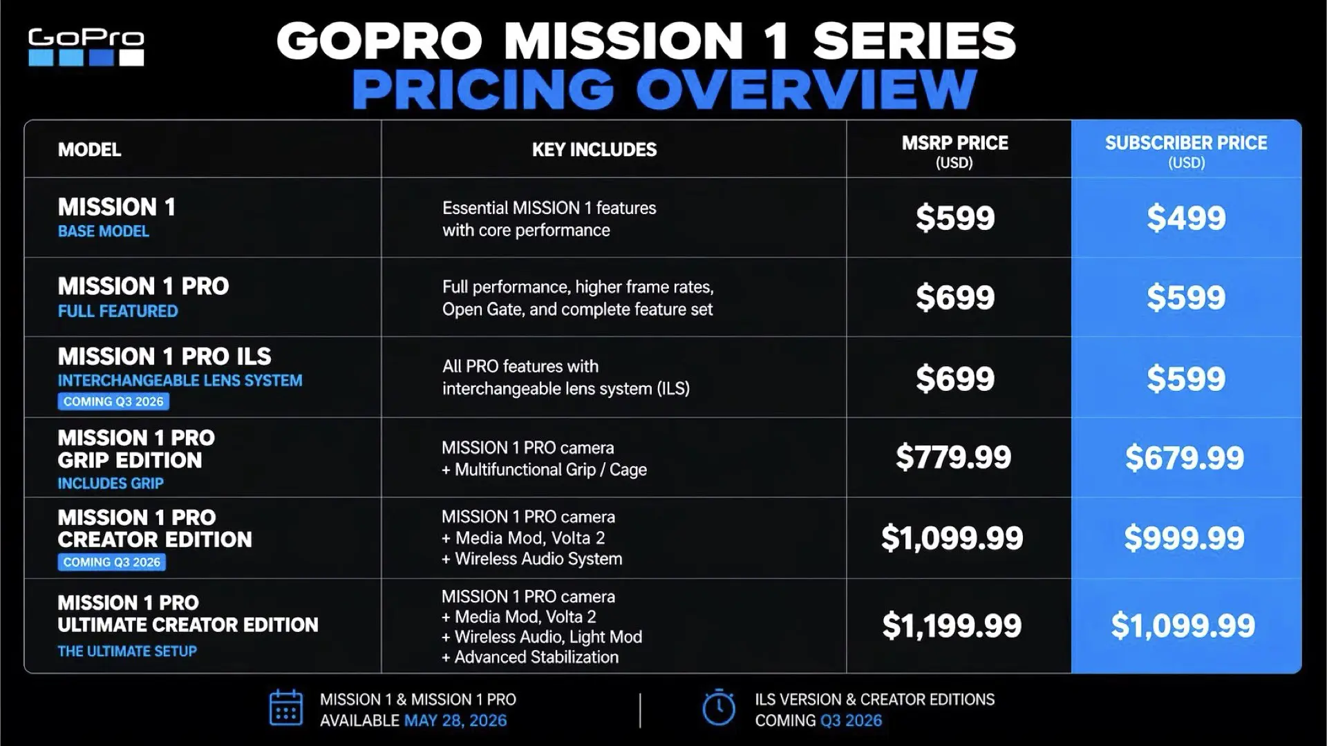 GoPro confirmed that the MISSION 1 and MISSION 1 PRO will be available starting May 28, 2026. Additional configurations, including the interchangeable lens version and creator-focused bundles, are expected to follow in Q3 2026.