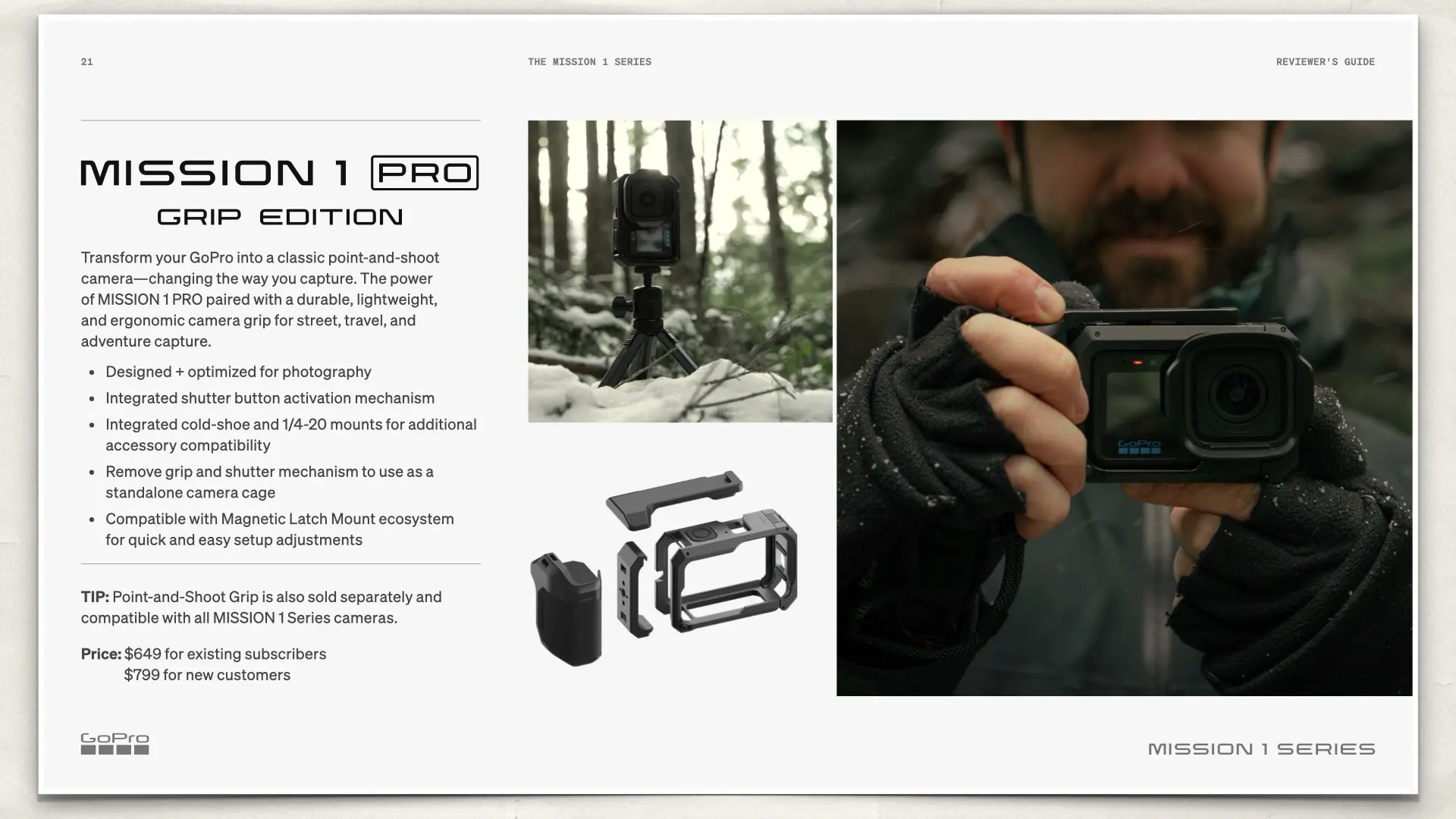 The base MISSION 1 is positioned as the entry model in the lineup, priced at $599 MSRP. Existing GoPro subscribers can purchase it for $499. This version is built on the same core hardware platform as the higher-end variants, including the new sensor and processor architecture, but with reduced maximum frame rates and Open Gate capabilities. It is designed for users who want access to the new imaging pipeline without requiring the highest performance modes.