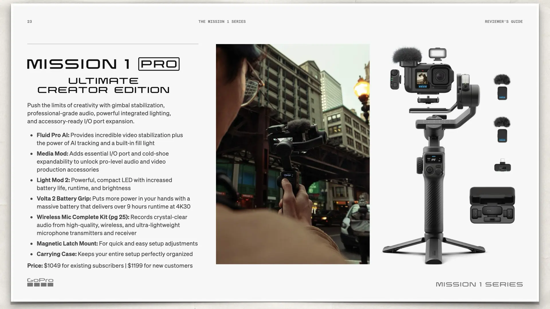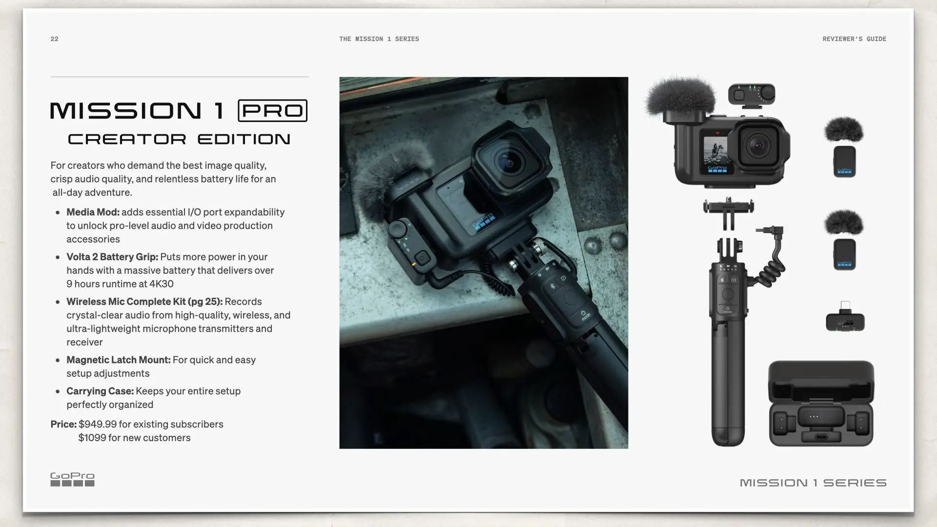 Beyond the standalone cameras, GoPro is offering several bundled configurations that integrate accessories into complete shooting systems. The MISSION 1 PRO Grip Edition is priced at $779.99 MSRP, or $679.99 for subscribers, and includes a multifunctional grip that also serves as a protective mounting cage. The MISSION 1 PRO Creator Edition will be available in Q3 2026 at $1,099.99 MSRP, or $999.99 for subscribers. This package includes expanded I O capabilities, a battery grip for extended runtime, and a wireless audio system, targeting creators who require a ready-to-use production setup. At the top of the lineup, the MISSION 1 PRO Ultimate Creator Edition is priced at $1,199.99 MSRP, or $1,099.99 for subscribers. This configuration adds advanced stabilization, lighting, and a more comprehensive accessory ecosystem, forming a fully integrated capture system.